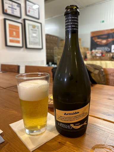 Vandaag, op aangeven van de medewerker bij de Bottega della Birra in het centrum van Sorrento (overigens, leuke bar met flink wat keuze uit speciaalbier, wel flink aan de prijs overigens), even een omweggetje door de heuvels van Sorrento gemaakt. Langs citroengaarden en uiteraard weer oppassen voor de scooters, komen we bij een typisch Italiaanse inrit, gelukkig wordt de brouwerij aangegeven, dus we zullen wel goed zitten. We worden allerhartelijkst ontvangen door dezelfde medewerker, het blijkt Carlo te zijn, die vol overgave met een kleine rondleiding door de goed uiteruste brouwerij begint. Aan enthousiasme geen gebrek. We vragen of we ook hier bij de brouwerij bier kunnen aanschaffen. Uiteraard is dat geen probleem. We krijgen in het fraaie proeflokaal nog een proefglas aangeboden en beloven dat we zeer binnenkort nog ‘beneden’ langskomen bij de Bottega, met daarbij misschien wel een heerlijke foodpairing in de vorm van kaas en worst. Kleine kanttekening, wat we helaas vaak zien in de zuidelijke landen, is dat de panden en omgeving er wel enigszins troosteloos uitzien. Daar kan zeker nog iets van gemaakt worden.