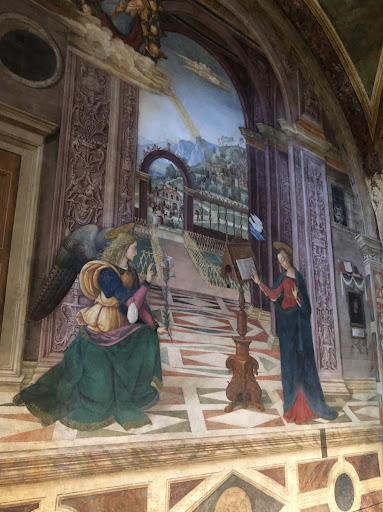 Conosciuta come "Cappella Bella", la cappella del Pinturicchio in Santa Maria Maggiore fu affrescata dal pittore umbro che tanto successo riscosse per il dotato senso decorativo nonché, festoso e cortese, raggiunto nel corso della sua carriera. Dopo aver decorato l'Appartamento Borgia a Roma, il Pinturicchio nel 1500 viene chiamato a Spello da Troilo Baglioni, Priore della Canonica di Santa Maria Maggiore, per affrescare le pareti di una cappella della chiesa che di li a poco sarebbe diventata l'unico esempio di superba pittura della rinascenza italiana, presente a Spello. Lontano dallo splendore della corte pontificia, dimenticato il fasto degli affreschi Borgia, l'artista a Spello recupera quella giusta dose di equilibrio prospettico e realizza un'opera singolare nel suo genere per unità spaziale di composizione e scrupolosa ricerca di proporzioni ed equilibrio. Nel ciclo di Spello il Pinturicchio affresca nella parete di sinistra l'Annunciazione, in quella centrale la Natività, ella destra la Disputa di Gesù fra i Dottori e le quattro Sibille nelle vele della volta. Nell'Annunciazione il pittore pone le figure della Vergine e dell'angelo in una sorta di spazio architettonico idealizzato, modello già usato in Aracoeli ed in Santa Maria del Popolo, dove l'accettazione dei divini decreti appaiono, nel volto reclino e luminoso della giovane donna, come trasfigurati in un unico atto riservato e pudico. L'angelo inginocchiato dinanzi la Vergine, con gesto devoto ed aggraziato guida lo sguardo sul pavimento scorciato verso il fondo dove eventi bellici si consumano tra mura urbane. Tutto qui profuma di aria della sua Umbria che ricondussero il Pinturicchio verso visioni più miti accurate e piacevoli.