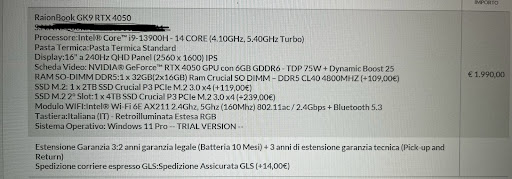 Read moreTempistiche eccellenti, servizio impeccabile e prezzi competitivi sul suolo italiano. Aggiungo infatti che i loro prezzi battono quelli di molti altri venditori internazionali, sui quali bisogna contare spese di spedizione o dogane. Vi consiglio caldamente di rivolgervi a RaionTech se volete un portatile high-end con componenti affidabili e come lo volete voi.