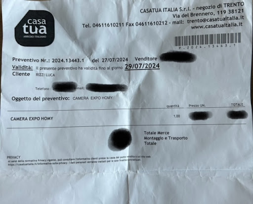 L’episodio è avvenuto in data 27/07, data in cui era fissato formalmente un appuntamento con l’addetta del negozio che ci avrebbe seguito nell’eventuale acquisto di una camera, un divano e un materasso matrimoniale. L’appuntamento era stato preso in occasione della nostra prima visita in data 13/07. Io e la mia fidanzata, dopo aver preso visione delle offerte in essere presentate in quel momento dall’addetta, avevamo scelto una camera in esposizione sulla quale era attivo uno sconto del 70% per via dell’imminente riallestimento della showroom. Per questa opzione è stato predisposto un preventivo ufficiale con indicata validità fino al 29/07. Da qui, abbiamo poi selezionato anche un materasso matrimoniale. Infine, per quel che riguarda il divano, l’indecisione ricadeva su due modelli differenti. (Chiarifico che, in nessun modo, tale indecisione poteva far intendere una assenza di intenzione d’acquisto).