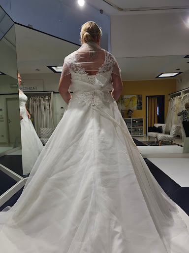 Entriamo dal lato "Sposo" e subito ci chiedono di entrare dall'altra entrata "Sposa" dove appena ci presentiamo ci rimandano nel negozio a fianco, e già qui... Spieghiamo cosa stiamo cercando e subito ci dicono che di Petrelli nella taglia richiesta (una comunissima 48) non hanno nulla e che non trattano più questa marca (e allora mi chiedo cosa mi avete dato l'appuntamento a fare visto che vi avevo specificamente detto che volevo vedere anche abiti di Petrelli e mi avevate specificamente risposto che era un marchio che trattavate?). Ma sorvoliamo su questi piccoli dettagli.