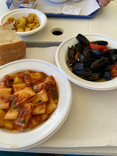 We attempted to do the right thing and asked a man stacking plastic chairs near the sunbeds where we should pay. His response (in Italian) was essentially, “I don’t know.” Not exactly helpful.