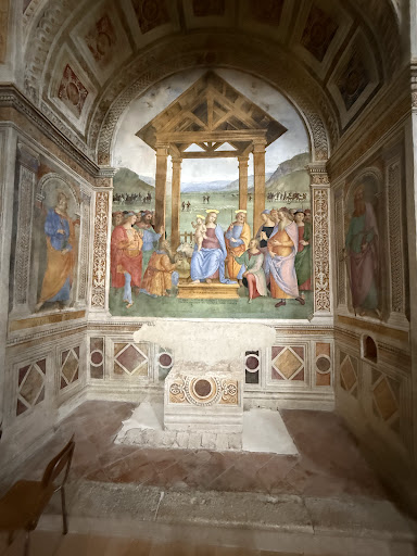 Read moreIl santuario fu costruito sul luogo dove esisteva la casa di un certo Diotallevi di Antonio che nel 1483 vi aveva fatto dipingere una Madonna con il Bambino e san Francesco. La sera del 5 agosto 1485 qualcuno vide il volto della Madonna piangere lacrime di color sanguigno. In seguito all'evento miracoloso si decise di costruire un santuario con il contributo del Comune e di alcune famiglie di Trevi e che divenne importante luogo di venerazione della Madonna. L’edicola originaria fu trasformata nell’altare in marmi policromi della chiesa e il san Francesco, che accompagnava la Madonna con Bambino, fu ricoperto da una cornice in stucco. All'interno, a croce latina e navata unica, numerose cappelle, due delle quali decorate da due tra i più importanti pittori umbri del Rinascimento, Pietro Vannucci detto il Perugino e lo Spagna. Il Perugino decorò la seconda cappella sulla parete destra della navata, realizzata nel 1521 e raffigurante un' Adorazione dei Magi con ai lati i Santi Pietro e Paolo. A Giovanni di Pietro, detto Lo Spagna, si deve invece il Trasporto di Cristo dipinto tra il 1518 e il 1520 nella cappella di...