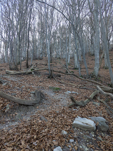 Il sentiero piega verso sinistra mantenendosi all’incirca sul crinale, poi si sposta sul fianco nord-ovest tagliando a mezzacosta una fitta faggeta fino a raggiungere il primo dei due bivi che conducono sulla cima Saben: sui cartelli questo è segnalato come “facile”, mentre il secondo “ripido”. In realtà non cambia molto: entrambi salgono con decisione nella fittissima faggeta che ricopre la parte inferiore della cuspide sommitale (nella traccia GPS percorsi entrambi, uno in salita l’altro in discesa).