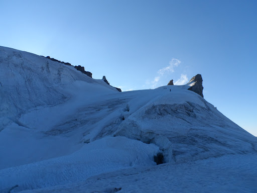 Auf dem Sattel angekommen, ca. eine Dreiviertelstunde unter dem Gipfel, gönnten wir uns ein paar Minuten Pause. Die Hitze war das große Thema am Berg. Weiter oben, knapp unter 4000 Metern, flossen morgens um acht Bäche. Einige Tage vorher hatte man die Normalroute am Mont Blanc gesperrt, dort hatte es Unfälle durch Steinschlag gegeben.