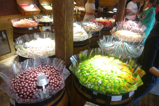 It basically uses a nicely themed decor to lure people and their kids in to scoop their overpriced "high quality" (they claim) candies. Their unit price is at least 3-4x more than a regular by-weight candy store. On top of that, some of their candies are huge/heavy, which are unique to this store, because the bigger or heavier they are, the more $$$$$$$. Just one of those cone or snake gummy is more than a 100g. Lol