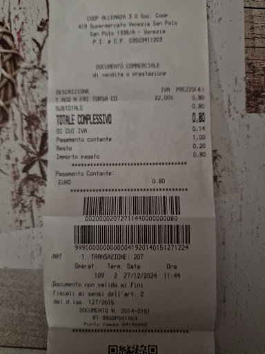Read moreWe stayed write around the corner from this CO-OP and we actually went to the other CO-OP jut because of the reviews. One day we decided to stop in since it was so close and I have to say ... The staff is very friendly. Have been in there about three times and the gentleman cashier says hello to me and Merry Christmas and asks about things. We even sang We Are the World together...LOL. He has a sense of humor and very helpful... As for people having a problem because they have to weigh or measure the breads or the fruits and vegetables...Just learn how it is done here...It is not a big issue. As for the self checkouts they are available in English and Italian and I have not had an issue. It does take cash. The store is small but it is close and in a central area..great for quick stuff...this is not a huge grocery store or a Walmart. Great to grab water for 25P for 1.5 liters when every restaurant was offering for 2.50... The walkways are tight but space is limited in Venice so just accept it and smile as you work around each other. Remember...