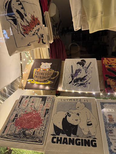Absolutely fantastic printed t-shirt & tote bag store! Recently established business is owned by young locals who sells only their own products. The shirt graphics are by selected local artists and the owners do it all by themselves from printing (by hand) to selling. The graphics are just amazing! The motifs range from simply funny (with a good taste) to deep, thoughtful, and critical. You really should read the presentation texts of the shirts on the wall, so as to really appreciate the art. The shirts come in selected colors and models only, meaning that you cannot choose the picture and the color of the shirt independently. The selection seems quite justified and is clearly well thought out, though. The shirts are of excellent quality, and the 100% cotton fabric is very comfortable (I was told that a transition to using organic cotton only is on the way, which would be a really nice move). The pictures are printed by hand, evidently with great care, so that even all details in the prints are of highest possible quality. Just amazing, keep it going guys! (And please, please open an online...