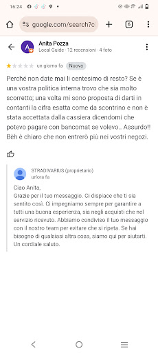 Read moreMi sono appena recata nel vostro negozio del centro commerciale Adigeo per acquistare una maglia. Ho chiesto alla commessa di colore dove poter andare a pagare e lei mi ha mandato alle casse automatiche. Non avendo il bancomat volevo pagare in contanti, e lei in modo molto maleducato, mi ha risposto di andare dall altra parte, molto arrogante. Le ho risposto che bisogna mettere delle indicazioni per i clienti che vogliono pagare in contanti, e lei molto arrogante mi ha detto di abbassare la voce anche se io non stavo urlando Le ho risposto che il cliente ha sempre ragione e lei mi ha detto non sempre, ma io le ho detto di aver ragione in questa...