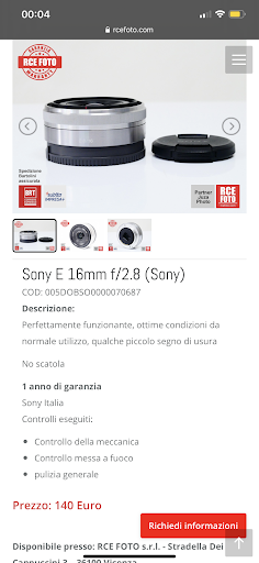 Read morePrima esperienza d'acquisto presso RCE della sede di Vicenza. Ho preso un obbiettivo Canon ef 50mm f1.2. Chi conosce questo obbiettivo della serie L di Canon sa che il prezzo del nuovo è davvero impegnativo, specie se non si è professionisti ma semplici foto amatori. Così ho optato per un usato garantito e ho ordinato da RCE dopo essermi documentato e letto le recensioni lasciate da chi ha acquistato prima di me. Ho scelto, tra le diverse opzioni d'acquisto, un obbiettivo venduto come "pari al nuovo"… ma ce n'erano altri a costi inferiori e sempre garantiti. Ho pagato un prezzo comunque importante per un usato ma ho decisamente avuto un risparmio congruo se rapportato al nuovo. La comunicazione con RCE è stata semplice, è bastato chiamarli al telefono per definire i dettagli e l'obbiettivo è stato recapitato molto celermente e molto ben confezionato. È arrivato in condizioni egregie… a parte un impercettibile graffio sulla plastica del copri obbiettivo, è impossibile dire che sia stato usato. L'obbiettivo è arrivato completo nella sua scatola originale con il copri obbiettivo frontale, quello posteriore, il paraluce e la custodia morbida. Ovviamente mi ero già procurato un filtro UV da applicare subito a protezione della preziosa lente (72 mm). La mia prima esperienza con RCE non poteva andare meglio e non posso che consigliare anche ad altri di acquistare da loro se si è in cerca di un buon usato… magari prendetevi il tempo di fare una telefonata per verificare la disponibilità e concordare i dettagli… troverete cortesia e assistenza...
