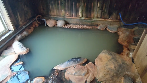 黒い不純物がふわふわ混ざったりするので、潔癖症の方は驚いてしまうかもしれません。しかしこれがまたいかにも天然温泉の感じなのかも。お湯は鉄分が含まれた緑白色でかなりぬるいお湯です。冬は一度入ったら上がれなくなるような温度ですので、やっぱり夏かな〜浸かった後はホッコリするので温泉効果あります(泉質 炭酸水素塩泉) お湯は白濁した緑見るからに鉄分が多そうなお湯です。