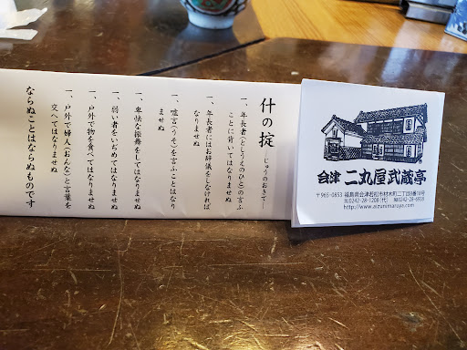 Read more会津若松駅からは かなり離れていますが、本当に風情のある素敵な空間のお店ですね。昔の昔 そのまた昔のような江戸時代にでも❓️タイムスリップしたような空間で二階を予約して家族で少人数でしたが 夕方からお邪魔しました。感じの良い若くて素朴で可愛い感じの店員さんが2階に案内してくれ木の風情のある古い階段をギシギシ上がった先は蔵座敷のような畳の上にレトロ感のあるテーブルに椅子の席でテンションが上がり会津に来た〰️❗️って感じがしました。会津八重御膳と、二丸御膳❓️八重御膳は、西会津産の、蕎麦粉も多く含まれている❓️蕎麦と季節のご飯とニシンの酢漬け❓️棒たらという会津古来の郷土食豊かな品々と、馬肉の煮物等々 二丸御膳の方は生麩の田楽が柔らかく田楽味噌も香り高くて香ばしくて歯触りも良くて蕎麦も わっぱ飯のようなご飯も 郷土食のイカ人参も最高に美味しかったですね。雰囲気とメニューの豊かさと美味しさで...