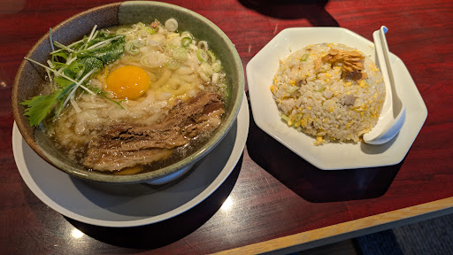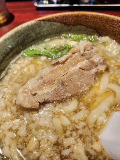 前回はめちゃくちゃ甘くて不評だったラーメン屋さんが店舗の外観そのままにうどん屋さんになった 食券を購入して席に座る…その座席数も前のラーメン屋さんと一緒 だが提供されるメニューや味は全くの別物 うどんの他にも色々とあって餃子やチャーハンの他にもなんか色々ある…うどんと何か別の物を頼んでもいいかもしれない とはいえメインの煮豚月見うどん一杯だけでお腹いっぱいになる スープは背脂がそこそこ入って魚介出汁に近い魚粉の味がするこってりだがあっさりとしたスープ…大きくて食べ応えたっぷりな煮豚チャーシュー…月見の名に恥じない卵…ネギが散らされた見た目も豪華なうどんである それでいて一杯1000円しない…うどんと考えれば高めかもしれないがこれほど大きな煮豚が乗っていてこれなら全然安い…大盛りも無料ならばなおさらである このうどん自体に何も問題はなく純粋に美味い…前回のラーメンに比べれば格段に美味い…全くの別物どころか前のイメージは一切無くして来店して問題ない しかし背脂に加え煮豚というけっこうヘビーなものが入っているため中途半端にお腹が空いている状態で食べると普通に残すぐらい満腹になる…煮豚はかなりしっかりとしている食感で味もかなり強め…背脂もそこそこしっかり入っているため人によってはクドく感じるかもしれない… それをうどんという食べやすい麺にしているからか一杯程度なら全然食べやすい…追加で他の何かを食べるなら腹ペコで行くべし ただしつけうどんというメニューを女性が食べる際は要注意…味がより濃くこってりさがより増したつけ汁になっているため通常のうどんが物足りない人にこっちを頼むといいかもしれない…個人的...