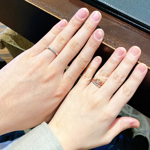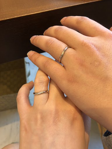 Read moreパートナーと共に婚約指輪と結婚指輪の購入のために伺いました。 予めホームページにて調べていた際に、すてきなデザインを見つけていたのでそちらのデザインを検討していました。 Web予約時にその旨をお伝えしていたところ、入店後スムーズに検討中のデザインのサンプルを見せていただけた他、そちらのデザインを中心に少しずつ違ったデザインもたくさんご提案していただき、実際に手元で見比べている所をあたたかく見守っていただきながら、二人でじっくりと時間をかけて決め、無事に購入まで至りました。 ホームページではつい華やかなデザインに目が向いていましたが、実際に手元で見ると、好みの形でもシンプルなデザインが自分たちにはしっくりきました。 しっくりきたその指輪を眺める度に幸せを感じられました。 すてきな時間をありがとうございます。 またお店に伺って受け取る日...