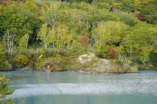 地獄沼は、酸ヶ湯温泉から徒歩約15分の場所にある硫黄泉が湧き出る湖で、エメラルドグリーンの水面と周囲の紅葉が美しいコントラストを作り出します。湖畔を歩きながら、山肌に広がる紅葉の美しさと硫黄の香りを楽しむことができ、写真スポットとしても人気があります。
