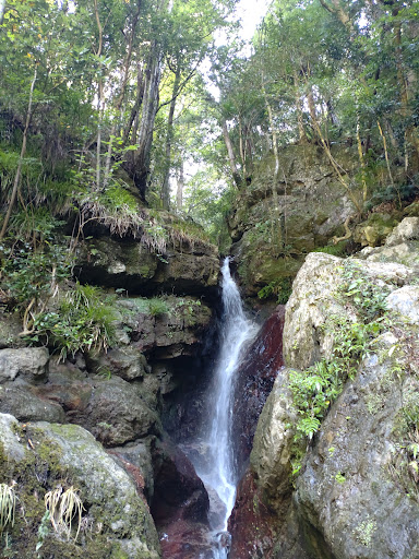 楠本谷川に流れ込む落差10mの段瀑。赤い岩壁の割れ目を流れ落ちています。基本的に前面道路に架かる渡瀬橋から見ることになるが夏場は少し木々が邪魔で見づらい。