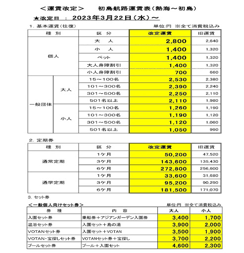 初島行きチケットは往復券のみで大人2800円。乗船時間は30分位。熱海港乗船時にチケットにスタンプを押してくれて、連泊したけど帰りの熱海港下船時に回収でした。 1日10便で1/5から船の定期検査で7便に減りましたが、今回のイルドバカンスプレミアは定員605人乗れるので問題無しでした。