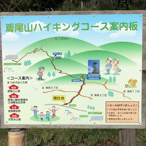 Read more本厚木駅からバスで30分くらい、 鳶尾団地、鳶尾山入口下車。天覧台公園からのコースでいきました。 展望台までは10分から15分。木立のなかなので、景色は楽しめませんが、その分展望台からの景色は圧巻です。 展望台から頂上までは、15から20分。 以外と急坂もらあり、滑りやすいので、靴は気をつけてください。頂上は少し広くなっていて、ベンチもあります。反対側に下山すると、厚木市みはる野にでるか、愛川町ハ菅山方面にもでれます。いずれも山道でなく、舗装道路です。 猿出没注意です。集団ていますので近寄らないで、ください!気軽なハイキング...