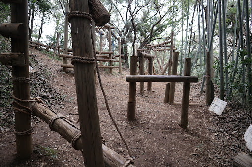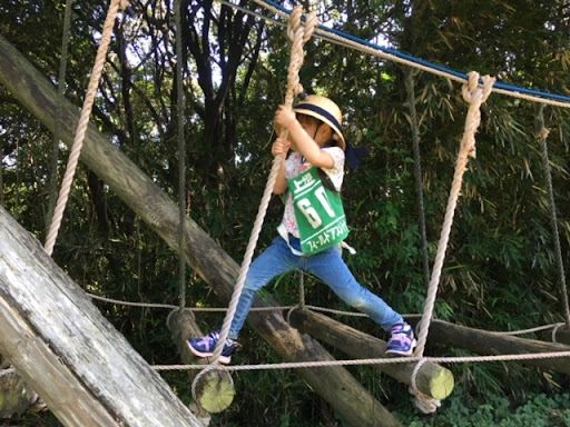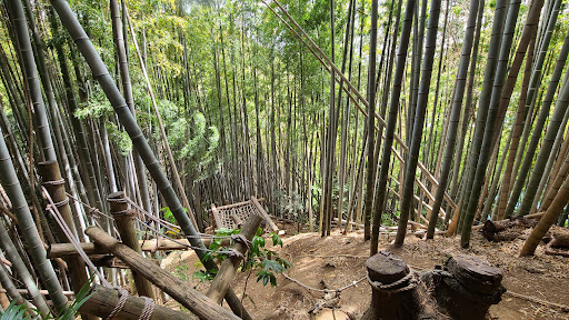 コースは、山を登って下りる間に写真のようなアスレチックが40箇所くらいあります。ターザンロープもあり、大人も少し楽しめます。 竹林の中を進む、探検気分の味わ...