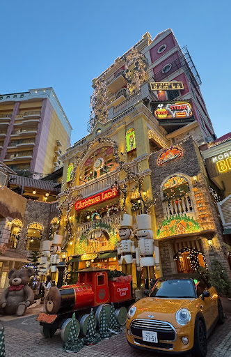 店舗外観も異国感があって素敵で夜はとくに見応えがあります。 店内2階には特大のクリスマスツリーやオーナメントが販売されていました。 2階に上がる階段のブル...