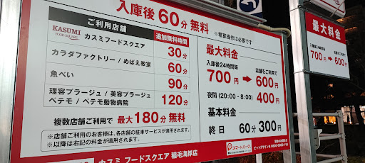 駐車場は有料。 正確には買い物客は60分無料。ただし、必ず無料ラインでも清算を、とのこと。 カスミの場合はレシートにあるバーコードを用意して、 精算機で自分の車のナンバー四桁を入れる。 自分の車の写真を選択、現金か電子マネー、カードで払う。