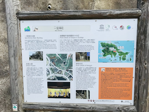 一宮とはその地域でいちばん位の高い神社のことですが、知夫里島の人は親しみをこめて「いっくうさん」と呼んでいます。知夫里島の南西にある神島(かんじま)に降り立った神様、天佐志比古命(あまさしひこのみこと)は知夫里島本島の御越鼻に渡り、仁夫里地区、そしてこの場所で落ち着いたそうです。境内には回り舞台も備えた芝居小屋があり、夏の例大祭は1760年代から続いています。隠岐では珍しく農村歌舞伎を奉納しており、中学生男子の白波五人男がおおとりを務めています。古びた石段を上がると正面にお社があり、左手に芝居小屋があります。芝居小屋の前は観客用にひな壇の作りになっており、緩やかな段々でゴザなどを敷いて見物できる作りになっています。特別駐車場などはありませんので、路肩に寄せ...