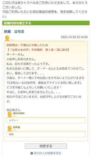 2022/10/26æ¥ã«æ¥œå€©ãéããŠäºçŽãããŠã宿æ³ãããŠããã ããè ã§ãã æ¥œå€©ã®å£ã³ãã«ãèšèŒãããŠããã ããŸããããå床ãã¡ãã®å ŽããåãããŠããªãŒããŒæ§ã«ãè©«ã³ç³ãäžããæ¬¡ç¬¬ã§ããããŸã(楜倩ã®å£ã³ãã¯å®¿æ³äžã«èšèŒãããã)ã