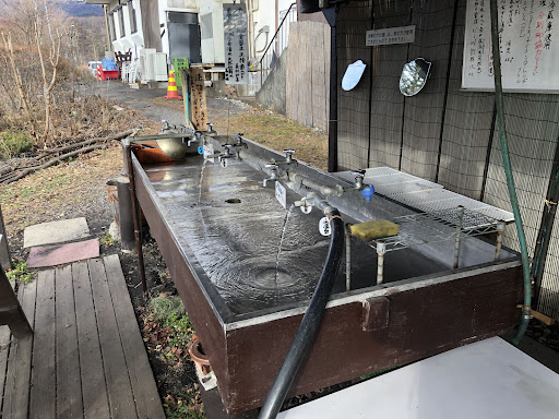 水場には水だけではなくて 温泉水が24時間流れているので洗い物がとても、しやすかったです。 トイレは、男子便器が外にありそれ以外は室内になります。そんなに遠くもなく、室内なのでこの時期としては暖かくゆっくり入れました笑