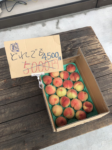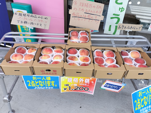 『朝採れとうもろこし』として売場に積んであったので、何気なく購入しましたが、市場に出荷しても値段のつかないであろう低品質の品物でした。実にシワが入り、甘味がありません。市場を通さない、産直のデメリットを感じた商品でした。規格外の桃は、一箱1200円。実が当たっていたり、まだ若く酸味のあるモノが混じっていますが、見た目と香りである程度判断できるかと思います。店内に笛吹産以外の仕入た桃も安く販売されていました。
