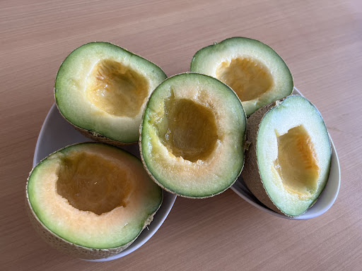 しかし、ここから一気に盛り返されることに! 仕方無しに次を取りに行くと、新しい番重が下に追加されております。そっと上の番重を持ち上げ覗くと半分に切られた新しいメロンが並んでいました。女性の店員さんが気を利かせて番重を退かしてくれてたので、甘いメロンは無いのかと聞いてみると、果肉の色が濃い方が甘いと思うとのこと、厳選して数個持ってまた席に着く。