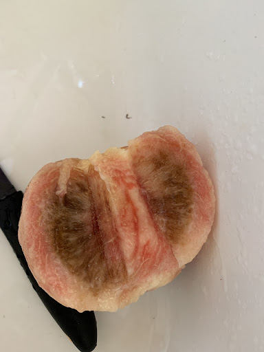 Read more何度も利用させてもらっていますが、パック入りの(箱入りではない)モモやスモモではさんざん痛い目に遭ってます。 午後に残っているような残り物ではほとんど、潤沢にあるうちに選んだものでも4割以上で大きな痛みや虫食いを経験しています(大抵ネットで隠されているので避けるのは難しいです)。 今回は(店員さんの目を盗んで)ネットを外して表面に痛みがないモノを確認して選んだのですが、切ってみると添付写真のように中だけ全周にわたってグジュグジュに痛んでいました。 3個1500円のモモの2個半がコレだったのでショックです。 農協の選果場ではじかれたのをここで売り抜けようとしてるんですかね?