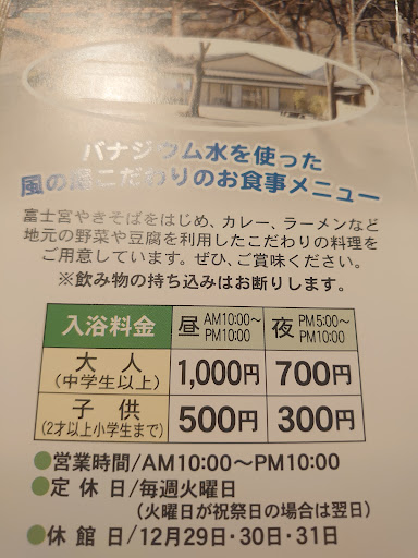 Read moreLovely place for an onsen! Quiet and spacious. Mon-Thurs are tattoo friendly days. For adults, opening till 5pm would be 1000yen, 700 yen from 5pm till closing Equiped with shampoo and body soap. There's sole scrapers too. For the guys, one large indoor warm pool, one small cold pool, dry sauna at 70 deg c, one large outdoor warm pool, one special...