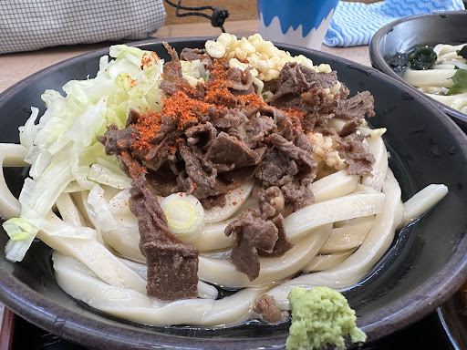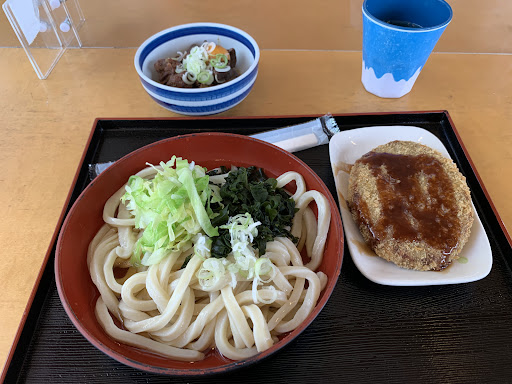 メニュー: ——————————————— 混雑時は分かりづらいですが食券機で注文〜支払いをして、食券に記載された番号で呼びだされるスタイルです。 名物の「肉うどん」をチョイスしてサイドメニューは「野菜かきあげ」と「とり天」をチョイス。 ・お好み:うどんの柔らかめ指定可能