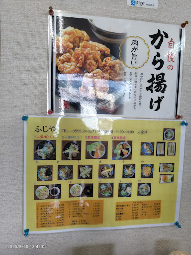 Read more夫婦共に歯応えのあるうどんが好みな為、妻と二人で歯応えといえばの富士吉田へ。ところが下調べが足りず夕方17時に到着してみると軒並み営業時間外。。。富士吉田は殆どのお店が14時にはお店を閉めてしまうそうなので注意が必要です。そんな中、夕方も営業しているお店の中で最もレビューが良かったふじやさんへ行ってみる事に。 週末のみ20時まで営業してくれているそうで界隈では貴重なお店な様です。 妻の優先度はとにかく歯応え。大抵のうどんやつけ麺では満足出来ないくらいの歯応えを期待しての来店。 私の優先度は薄味でも出汁がしっかり出ているかどうかと程好い歯応え。 冷やしうどんは500円しないしふじやうどんも海老天、ちくわ天、肉、ワカメが入り800円しないのでとてもリーズナブル。 早速その内容で注文してみる。 注文から5分もしないうちに出て来たのでちょっとびっくり。麺は思った以上に極太でこれは歯応えに期待出来ると妻も期待を膨らませながら一口。しかしその期待はすぐに裏切られてしまいました。 茹で置きなのだと思うが噛んだ食感が太さの割には軟らかく、妻は一口で箸を止めてしまいました。 私からしてもこれはちょっと物足りないなと感じましたが、私達夫婦程にコシを求めていなければ普通にコシのあるうどんと感じる方もいるかなくらいの硬さかなと思います。 茹で置きなのだとしたら来店時間にも左右されそうですが。 しかしレビューで4を付けてますのでその他の部分でかなり私は満足した事になります。 冷やしうどんはやさしい味でしたがしっかり出汁が出ており、極太麺に負けない見事な味付け。ワサビとゆず胡椒が添えてあり、それを混ぜると更に美味くなりました。この味付けは相当私の好みで麺のがっかり感を完全に払拭するだけの説得力のある物でした。 価格もリーズナブルでこれで麺が好みの硬さであれば満点をつけられるかなと思いました。 温かいふじやうどんは他でも指摘されていますが冷やしうどん程の感動はありませんでしたが、ひたひたのちくわ天が私好みで物凄く美味しかったです。天カスが美味いので、天ぷらも各種美味しいのだろうと想像がつきます。 再来店の際はゴリゴリの茹でたて麺に出会える事を期...