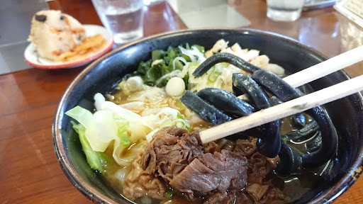 それほど時間かからず到着 冷やし黒うどんは海老天が3本そそり立ち見た目のインパクトは十分だが、内陸の山梨に海産物を期待してはいけない。海老は長いが衣が厚め。ちょっと残念。 盛り皿は浅く大きいがつゆの量が少ないので、茹でキャベツなどの具材がつゆに浸しにくい。つゆの味も控えめで、店内でダラダラ汗をかいてる身としては塩気が足りない。 肝心の麺はひばりが丘高校のなので最も恐れる歯応えを期待していたが、竹炭を練り込んであるせいか通常のより柔らかくなって拍子抜け。竹炭の香り?風味は特に感じられず。吉田うどんでこの麺にするメリットを感じられなかった。