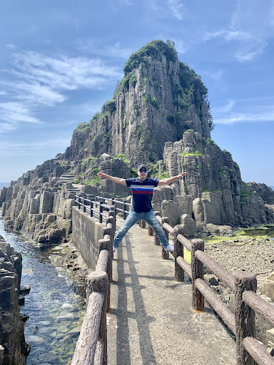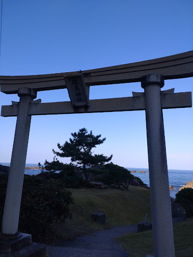 This Island of Hoko-jima is formed by saw-toothed rock formation of Echizen Coast just in the same pattern with famous Tojinbo located in the north. According to the history there was a statue of Fudo Myo-o discovered by a fisherman from Echizen while he was out for hunting. Revelation was told that it should be kept enshrined up on this rock. That's the shrine built up on this Hoko-jima. This rock is 80 meters in circumference and 50 meters in height. There is a stairs that you can go...