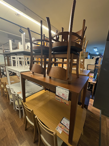 Read more後に予定が控えている中での訪問だったので軽く流し見ただけですが品揃えはあまり多くない印象。店舗が広くはないので 一部のお客さんには店員さんが付いてその家具の良いところ悪いところ?魅力?を紹介していました。店員さんが付く条件は分かりませんが恐らく尋ねる等すれば丁寧に教えてくれるのだと思います。少なくとも流し見ただけの私達についてくることはなかったので、接客に関しては分かりません。 なので星2になっているのは別の点です。駐車場が入口から離れていて庇も無いので雨天時に不便(出入口前にもあるけど数少なめ)、店舗内が狭く陳列幅も取られていない為ベビーカーや車椅子は通れない、現品のみのテーブルの上に椅子が載せてある。 より多くの家具を陳列しようと思うと仕方ないことではありますが人が普通に歩いて通るのにもなかなか狭かったです。そして雑多な感じがして見にくい。売約済の家具もそんな中にあるものだからうっかり誰かに傷付けられてしまうかもしれないなと、流し見しながら思いました。 悪気なくとも鞄の金具が当たって…て有り得そう なので気になったソファはあったけど再度訪問して確認して購入、のイメージがイマイチ出来ず。子連れでなく、時間もあれば厳選された家具をゆっくり見て...