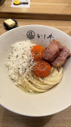Having lived and cooked in Italy for 7 years, I had high hopes seeing this restaurant on Google with a very high score. However the carbonara, as stunning as it looks, just tastes very bland and mediocre. A key problem I see is that the taste of the meal is forgone for the sake of not mixing the ingredients to be more presentable. Mixing the udon/pasta with egg yolk, cheese, and much more pepper than used here in a semi-hot pan is key to achieving the perfect rich and thick consistency usually seen in a authentic carbonara. This helps coat the pasta and reduces the liquid content of the sauce which makes it even richer.