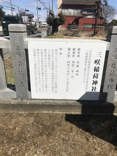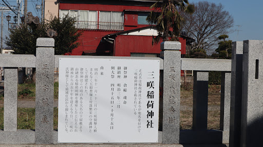 Read more新京成線三咲駅から徒歩約20分、境内に三咲神社の由来が書かれた掲示板が設置され、次のように説明されています。 「三咲稲荷神社 正式名は稲荷神社であるが地名を付けて三咲稲荷神社と称されている 御祭神 倉稲魂命(ウカノミタマノミコト) 御鎮座 明治三年二月 例大祭 四月十五日・十月十五日 由来 明治二年十一月・十二月の三咲開墾入植まもなく五穀豊穣と村落繁栄の守護神として創建された。御祭神はこの時のある大名の下屋敷より由緒ある稲荷明神を遷座したと伝えられ鎮座から百五十年を迎える今日、三咲の氏神様として地域住民から親しまれている。」 境内には他に、新四国八十八ヶ所吉橋大師講札所第四十四番、三咲百年記念碑、百五十年記念碑や力自慢...