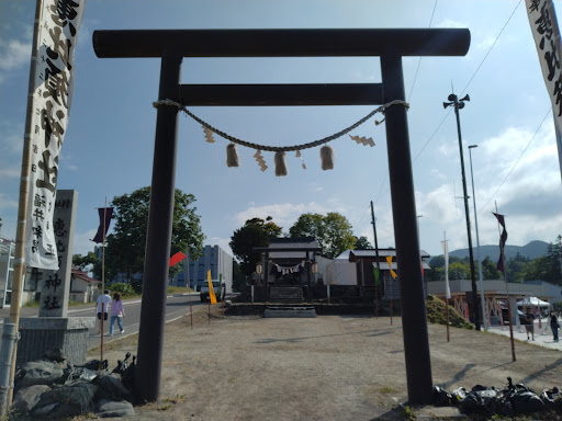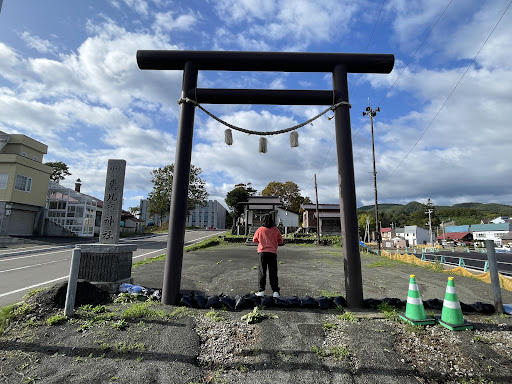 Read more古平役場の前にある神社で、御際神は「恵比寿」さまのようです。 写真の通り、何故か鳥居の下には土嚢が敷いてあり、跨いで通りました🤔