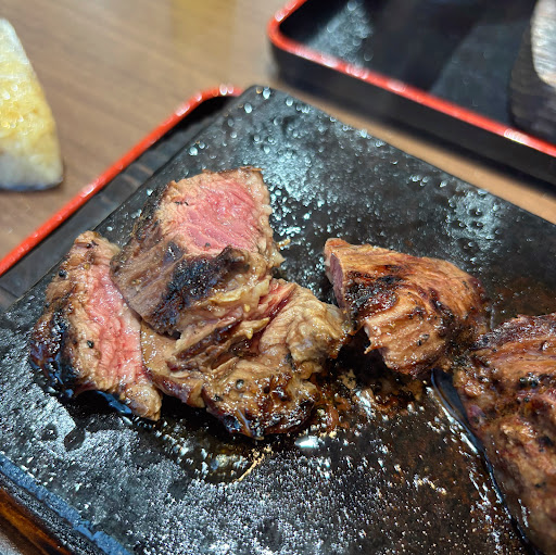 購入後、トレイにカトラリーを並べ お肉が焼き上がるのを待ち、受け取ったら その先にあるご飯をポン!(ワンタッチで自動) 食券も見せないまま終わります。 あつあつの重い鉄板ごとくるのでご注意を。 あとはお味噌汁やご飯のお供をとって席に。