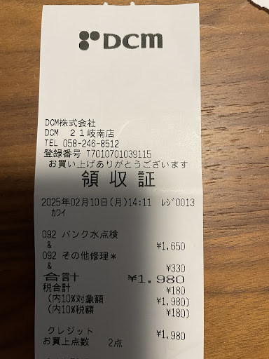 Read more自転車売り場のパンク、虫ゴム交換費用は、6年前に比べてかなり割高になりました。当時は、東京の島忠より安くて感動したが、2025年2月10日現在、どこよりもぼったくり価格になってしまった。そもそも、修理作業を全くしない中年のおばさんが一日中レジに張り付いている固定費まで、客に負担させておりたまげた。どこのホームセンターも6年前のカーマ 岐南店も、修理のできる男性二人以外誰もいなかったし、いないのが普通だ。東京の島忠は、今日現在、パンク修理が税込1,650円、もしチューブをバケツの水につけてパンクが発見できなくとも、虫ゴム部品代と交換費用300円は追加で請求されないので、1,650円だけで済む。これに対してカーマ は、虫ゴム代と交換費用330円上乗せされて1,980円になる。ちなみに、島忠がパンク修理が1,650円に対して、カーマ は2,200円もかかる。修理の出来そうな中年の男が二人いますが、一人だけ作業にあたっているだけで、もう一人は来店した客に、氏名、住所、電話番号を伝票に書かせているだけで、ポケットに手を突っ込んで暇そうにしているだけ。客に個人情報を書かせているのに、突っ立って座って書いている客を見下ろした態度はありえない。6年前のカーマ 岐南店は、男性二人とももっと若くて親身に話を聞いてくれたのが懐かしい。パンクの修理は、町の自営の自転車屋かコーナン岐阜店に行きましょう。カーマ は、自転車売り場だけでなく、あらゆる商品が高くなってしまい、店にない商品は問屋から送ってもらう送料660円を商品価格とは別途請求する、かなり悪どい商売をしています。皆さん、カーマが取り扱っていない商品は、Yodobashi.comで送料無料で買いましょう。50円の掃除機フィルターも送料無料でゆうパックで届けてくれる。何を買っても商品代金だけで済み、しかも商品代金もカーマ やコーナンよりも断然安い。しかも翌日配達してくれる。カーマ のマイポポイント還元率は、たったの0.5%でyodobashi.comは10%です。キャンペーン期間に買えばヨドバシは13%です。同じDCMグループのホダカは、一本4円のネジさえ電話一本で送料無料で店に取り寄せてくれ、納期は翌々日になります。そもそもカーマの店員は、ホダカの店員を見倣うべき。自転車売り場だけでなく、どの店員も、東京の島忠やコメリの岐阜店、ホダカに比べて、顧客の困りごとに寄り添う気持ちがなさすぎる。本当にサービス態度が酷くで価格が高いだけである。汗水たらして稼いだお金を、カーマ...