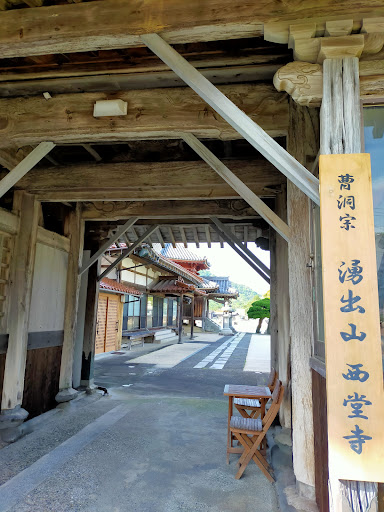 江崎の港は深い入江の奥にあり、浪おだやかな所である。 六角堂はその入江に浮かぶ島にある。 石橋を渡って境内に入る。 境内には本堂、六角堂、仁王像に守られた楼門、寿楽観音像、石灯籠などがある。