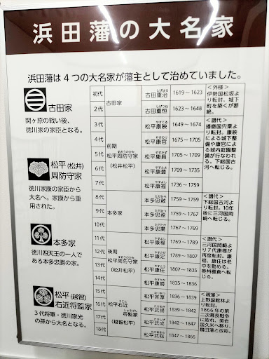 2019年に開館した資料館。観覧は無料です。 もともとの御使殿を改装しただけあって、風格ある外観の建物です。 中には多数の説明パネルやビデオ映像、城の模型や古文書などの展示品が並び、浜田藩の歴史や浜田城の成り立ちについて紹介されています。 一般にはあまり認知度が高くないと思われる浜田藩の歴史、とくに幕末の長州藩との戦いなどは非常に詳しく説明されています。また今は石垣しか残っていない浜田城の構造も、模型などで理解できるようになっています。 これだけの歴史を持つ城なのですから、資料館だけでなく、実際の城跡のほうももう少し整備してもらえたら...