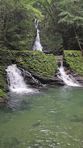 すれ違いに気を使う山道 カーブの路肩に駐車しました けもの道的な下りを数分すすみますとたどり着きます 運動靴の方がいいかと! 滝壺で泳いている方もいらっしゃいました 女滝という名なように 細めでやわらかな感じです 気をつけてどうぞ!