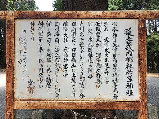 延喜式内鄉社於吕神社 御祭神は天津日高日子穂穂手見合 別名 天津火火出見尊です 天照皇大神の御子慶々杵尊が御父 木花開耶姫が御母 九州高千穂峯に崩ぜられ御陵は今日向国管ノ口日高山に上陵せられ 国幣大社鹿島神宮です 徳川幕府は遠江国鎮守として御免勧を許可され勅願に依り勅使を伺候御祭を奉じ我が国数少い神社です 注 延喜とは130...