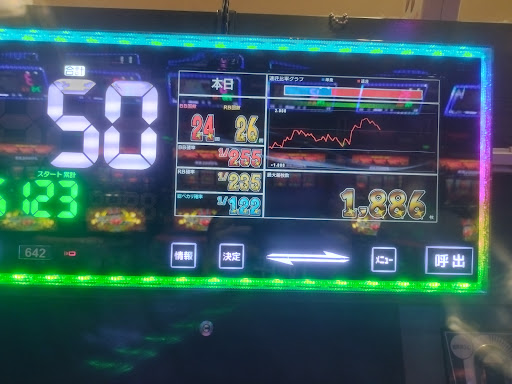 Read more初めて行き 2万3千円換金しましたが 全然出ないです。アイムジャグラーで昼過ぎから夜20時位までやりました。前日バケ先行台で前日BIG22REG24で 朝35回転でバケ引いていたので 設置上げて有ると思い 2千円でBIG引きその後 調子良くバケ先行ツモったと思いますが 合算が前半80代で その後も120を切る事なく バケ先行で回数重ねましたが バケ先行しすぎで 一時BIG9 REG19に成りバケ先行しすぎると あまり出ないのが分かってますが 後半BIGとREGがほぼほぼ同じ位にまできて 1800枚まで突入してから またまた波が悪くなりバケ先行で 結局 換金2万3千円! 入店した時は 前日7の日だったので 回数付いてるけど 波荒い感じで 今日も 回数だけで 皆 出てなくお客さんも直に引いてしまうし 電圧下がってまた掛かりが悪くなるし この店はいっちゃ悪いが ホルコン操作しすぎです。もろ分かります(笑) 店長さんもう少し考えてホルコン操作して下さいね! ま〜2万1千円買ったから良いけど...