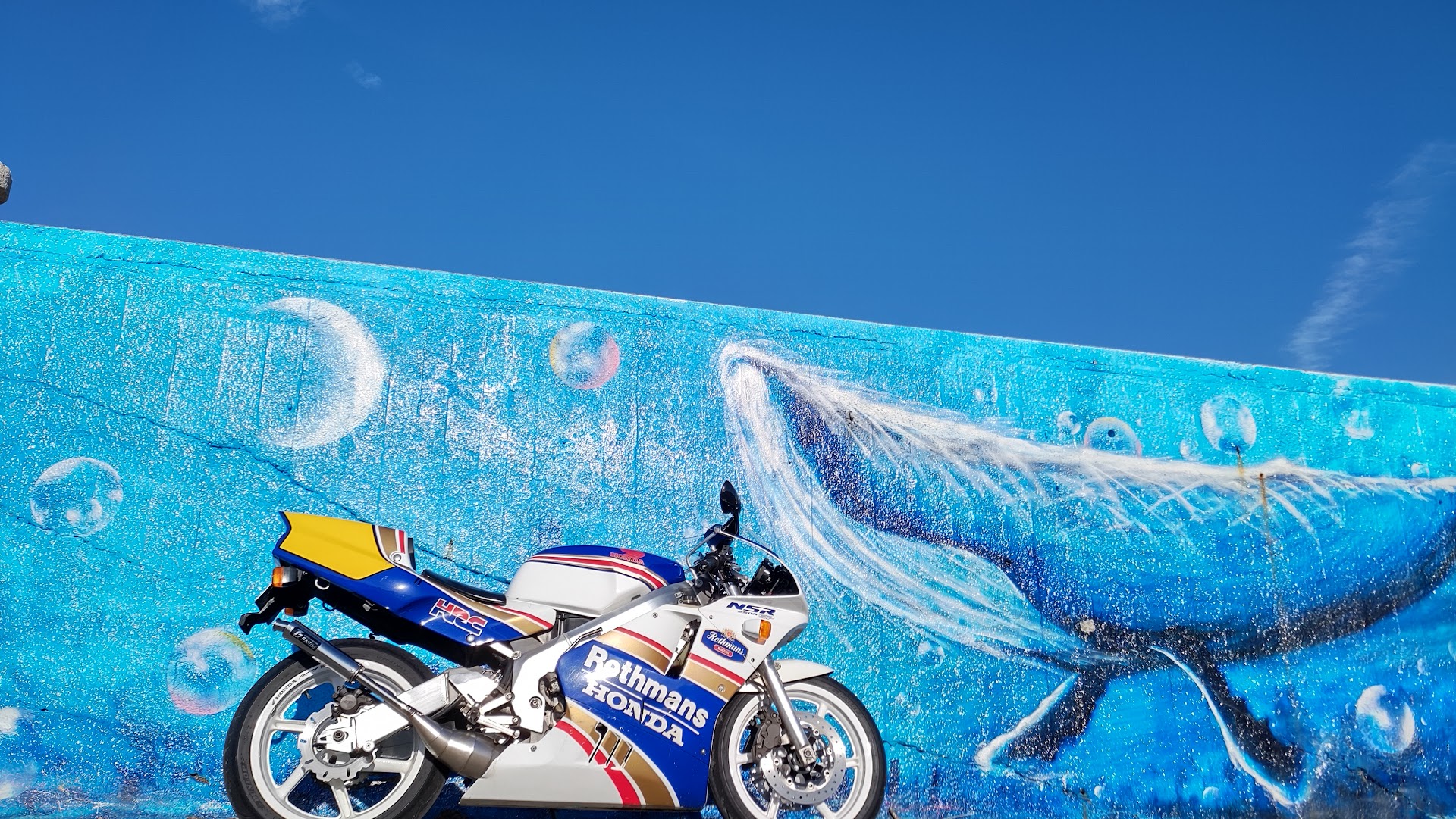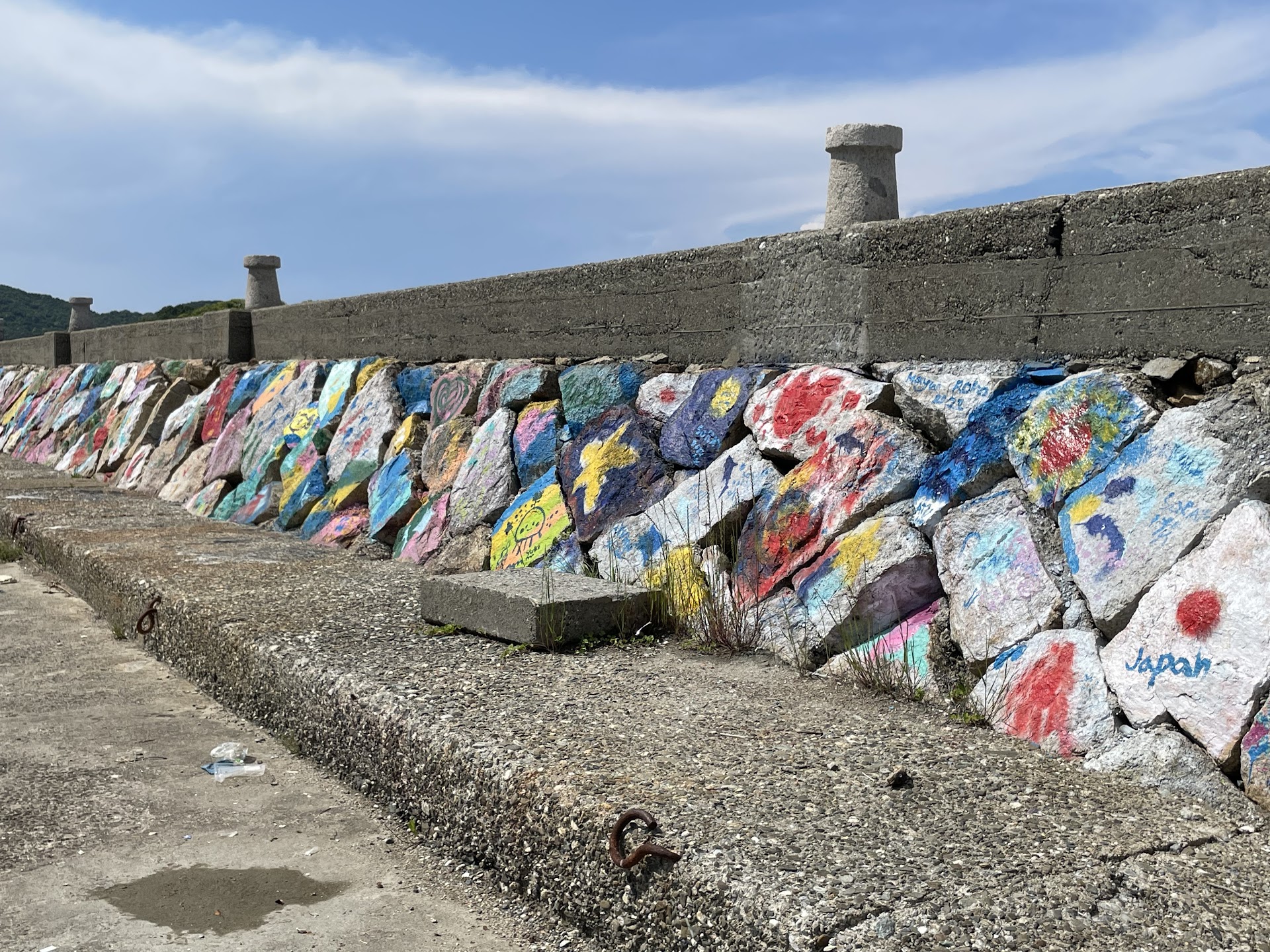 漁船が停泊している漁港の西側の端に壁面アートの入口があります。ゲートのあるほうを入って行くと壁面(防波堤)の上を走れます。下の道を防波堤沿いに入って行くと壁面アートの前を走れます。