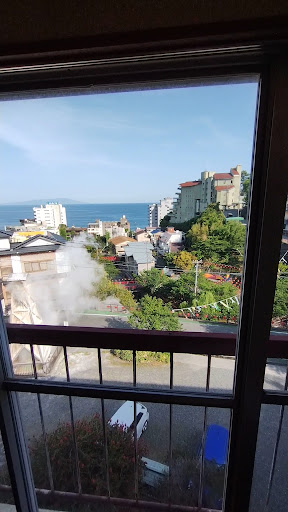 simpleな独り旅を好きな 若い女性にも 最適。 スタッフ皆さんfriendly💖 潮風と想像を絶する量の温泉噴気の影響を受け続けている外観に反してお部屋も浴室も綺麗です。 男女別々の 共用お手洗いも ピッカピカ。 清潔な共用の冷蔵庫が給湯室にあるので名前か記号を明記して利用。 部屋にお茶セットはあるけれど お茶菓子はありません でも 夕食は一番少ない量のでも 刺身(帆立 海老 超甘い烏賊 鮪) 蒸してある大海老 海老フライ2本 キャベツ千切り 鍋(豚肉と 野菜) 茶碗蒸し(銀杏 鶏肉など) 吸い物(浅利) 沢庵 🍊美味しく頂きました。 私の真後ろに男性がこちら向きに座る配置でしたので もっと離して下さると落ち着いたかも。次回は誰の目線にも入らない端のテ~ブルにするよう お願いしてみます。 清潔なシ~ツで布団を自分で好きなように敷き ぐっすり。 ドアは しっかり鍵をかけ椅子で支えて廊下からの😱万が一の侵入をガ~ド。 波🌊音の替わりに噴湯の響きが子守歌🎶 部屋に金庫は無いので貴重品は自分で管理します。 朝湯の気持ち良いこと🥰 熱めでも湯口から離れると少し温くなり柔らかな少し塩あじのお湯。 女性には掛け流しが嬉しい🎵 ヘアコンディショナや化粧水 クリムなどは持参。 クチコミにあった 4階エレベーター横の「お楽しみ」な窓を 開けてみました。 な~るほど🚈🚋🚋🚋🚋🚋🚋 窓には 柵が無いので 気をつけて下さいね 🌞朝食が楽しみです。 2024 2 12