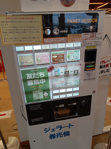 しかし、ここを目的地とした第一の理由はその名産品ではなく、評価の高いジェラードを喰らうこと。 この施設自体は9:00オープンなのだが、ジェラードのコーナーと隣接する「マリオンクレープ」は10:00オープンなのでご注意。 券売機でチケットを求めてからフレーバーを選ぶスタイルなのだが、この日は平日100円引きの提案もある。 ただでさえダブルが400円であるというのは安価な上、LINEのともだち登録さえすれば300円に変わるのだから、それは従ったほうがお得だ。 提供されてすぐにでも、カップから溢れ落ちそうなほどに盛られたジェラードは圧巻。